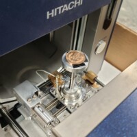 走査電子顕微鏡(SEM)は試料表面の微細構造の観察及び分析装置として、バイオから半導体、エレクトロニクスまで、多岐にわたる分野で幅広く利用されています。SEMは汎用的なツールである反面、設置場所の制限や、良好な画像を取得するための操作習得や観察条件設定に時間を要する、といったことがあります。試料表面に電子線を照射し、反射した電子線を像として映し出し、観察する装置。試料室(チャンバー)内を真空状態にし、超深度レンズ(電子ビームの照射)により試料を撮影します。光学レンズと超深度レンズの画像を合成し、精細な画像を 得ることが可能です。